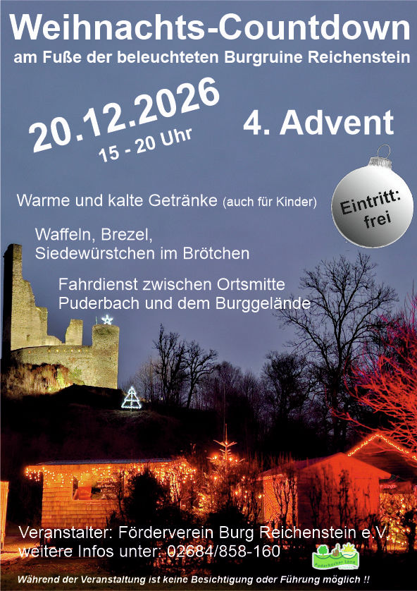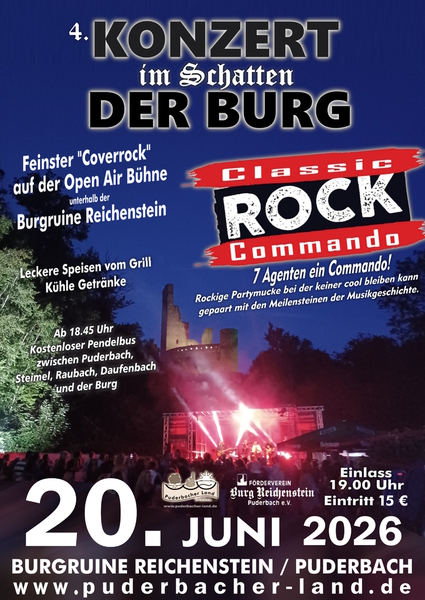 Am Samstag, 20.06.2026 findet das vierte „Konzert im Schatten der Burg“ statt. Auch in diesem Jahr wird wieder das Großmaischeider Classic-ROCK-Commando am Fuße des Burgberges die hierfür extra aufgebaute Bühne mit feinsten Coverrock der letzten Jahrzehnte beben lassen. Für das passende Ambiente wird die Burg zu diesem Event angestrahlt. Während der Veranstaltung wird ein kostenloser Pendelfahrdienst ab 18.45 Uhr aus den Gemeinden Puderbach (Rathaus), Steimel (Marktplatz), Raubach (Busbahnhof) und Daufenbach (Haltestelle bei Landhaus Haag) angeboten, wo unter anderem ausreichend Parkmöglichkeiten zur Verfügung stehen. Für das leibliche Wohl wird bestens gesorgt sein.