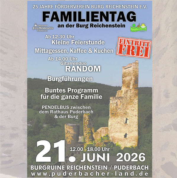 Am Sonntag, 21.06.2026 steht das Gelände ganz im Zeichen des 25-jährigen Jubiläums. Die Besucher erwartet ein Buntes Programm für die ganze Familie. Burgführungen, Aktionen für Kinder, Feierstunde zum Jubiläum unter Mitwirkung der örtlichen Kindergärten. Ab 14 Uhr musikalische Unterhaltung mit dem Guitarrenduo Random. Für das leibliche Wohl mit Mittagessen, Kaffee und Kuchen, kalten Getränken und Snacks ist bestens gesorgt. Weiter gibt es Informationen über die Arbeit des Fördervereins der letzten 25 Jahren zum Erhalt des Wahrzeichens des Puderbacher Landes. Aufgrund der begrenzten Parkplätze fährt ab 11.45 Uhr ein kostenloser Pendelbus zwischen dem Burggelände und dem Buswendeplatzes am Rathaus Puderbach.